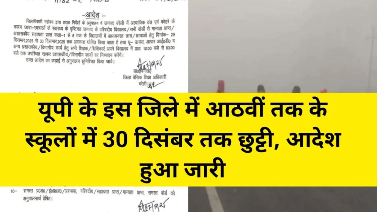 नमस्कार दोस्तों! उत्तर प्रदेश में कड़ाके की ठंड और घने कोहरे (dense fog) का प्रकोप जारी है, जिससे कई जिलों में स्कूलों की छुट्टियां बढ़ाई जा रही हैं। हाल ही में जारी अपडेट्स के मुताबिक, बरेली जिले में कक्षा 1 से 8 तक के स्कूलों को 30 दिसंबर 2025 तक बंद रखने का आदेश जारी … Read more
