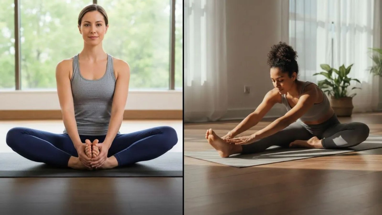 Seated pose gently opens inner thighs and hips; great for beginners.