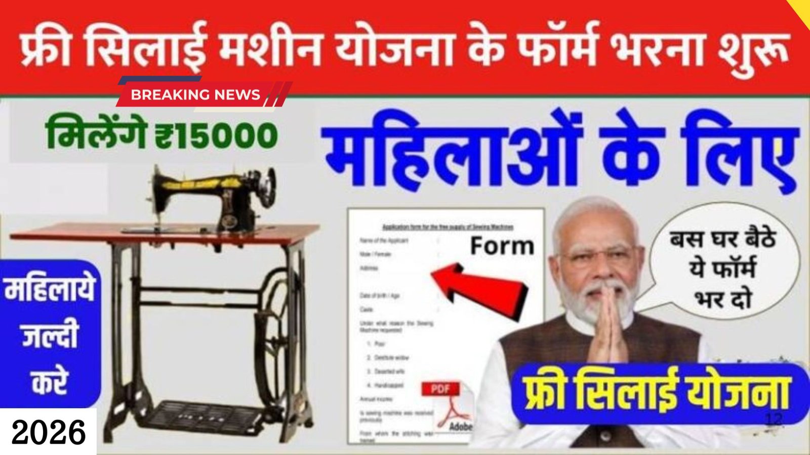 महिलाओं और कारीगरों को आत्मनिर्भर बनाने के लिए केंद्र सरकार की पीएम विश्वकर्मा योजना के तहत सिलाई मशीन योजना चल रही है। यह योजना घर बैठे सिलाई का काम करने वालों को बड़ा सहारा देती है। इसमें मुफ्त सिलाई मशीन मिलती है। साथ ही ट्रेनिंग और सस्ता लोन भी उपलब्ध होता है। योजना 2023 में शुरू हुई थी और 2026 तक चल रही है।